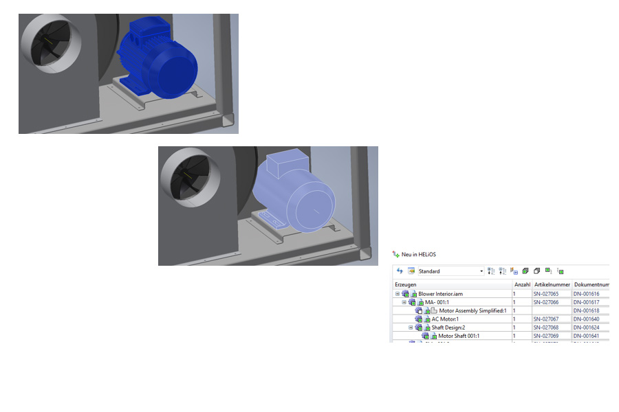 Abgeleitete Ersatzobjekte können in Inventor genutzt werden, um eine Baugruppe durch eine vereinfachte Darstellung zu ersetzen. Diese Objekte werden jetzt auch in der HELiOS-Integration unterstützt. Der Artikel der dem Ersatzobjekt zugrunde liegenden Baugruppe wird ebenfalls mit dem Dokumentstamm des Ersatzobjektes verknüpft. Der Dokumentstamm wird in HELiOS direkt als Ersatzdokument gekennzeichnet. Der Attribut- und Stücklistenabgleich erfolgt damit immer aus der ursprünglichen Baugruppe. Ersatzobjekte müssen gemeinsam mit der zugrunde liegenden Baugruppe nach HELiOS übernommen werden und können nur gemeinsam mit dieser abgeleitet werden.