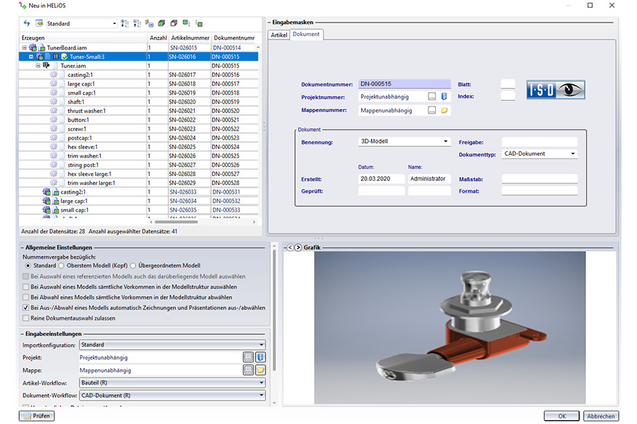 Die Inventor-Integration ist um zwei neue Funktionen zum Platzieren von Bauteilen erweitert worden. Bei der normalen Platzierung erfolgt die Auswahl des zu platzierenden Bauteils mit der Kombisuche. Außerdem können zuvor vorgemerkte Bauteile direkt zur Platzierung eingefügt werden. Die Vormerkung speichert jetzt auch zusätzlich den ggf. vorhandenen Artikelkontext und funktioniert auch applikationsübergreifend (z. B. Vormerken im HELiOS Desktop und Platzieren im Inventor).