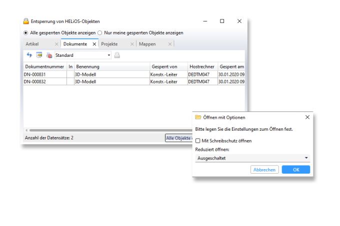 Beim Entsperren von HELiOS-Objekten kann der Administrator jetzt zwischen seinen eigenen Objekten und allen gesperrten Objekten umschalten.