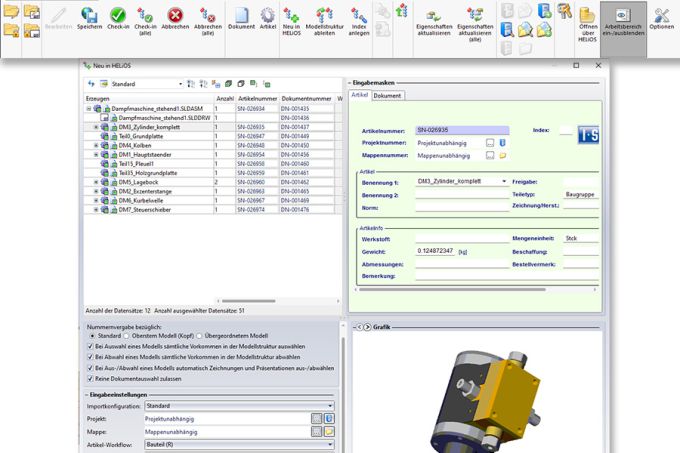 Die SOLIDWORKS-Integration wurde umfassend aktualisiert und bietet jetzt - analog zur Inventor-Kopplung - mit der Funktion Neu in HELiOS ein effektives Werkzeug zur einfachen Übernahme von Daten. Darüber hinaus sind Funktionen wie z. B. das Umloggen hinzugekommen und die Optionen der Kopplung hinsichtlich der Aktualisierung von Indexständen beim Laden von Bauteilen/Baugruppen wurden stark erweitert. Weitere Funktionen sind für die kommenden beiden Service Packs geplant.