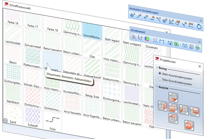 Die Auswahl der Schraffurmuster bei der Definition und Änderung von Schnitt- und Detailansichten sowie Ausbrüchen ist überarbeitet worden. Zur Auswahl von Schraffurmustern wird jetzt das Dialogfenster Schraffurauswahl angezeigt. Hier stehen die verfügbaren Schraffurmuster übersichtlich mit Vorschau und Überschrift zur Verfügung. Wird mit dem Cursor auf eines der Muster gezeigt, dann werden weitere Informationen zum Schraffurmuster angezeigt. Darüber hinaus lässt sich die Anzeige der Muster zoomen.