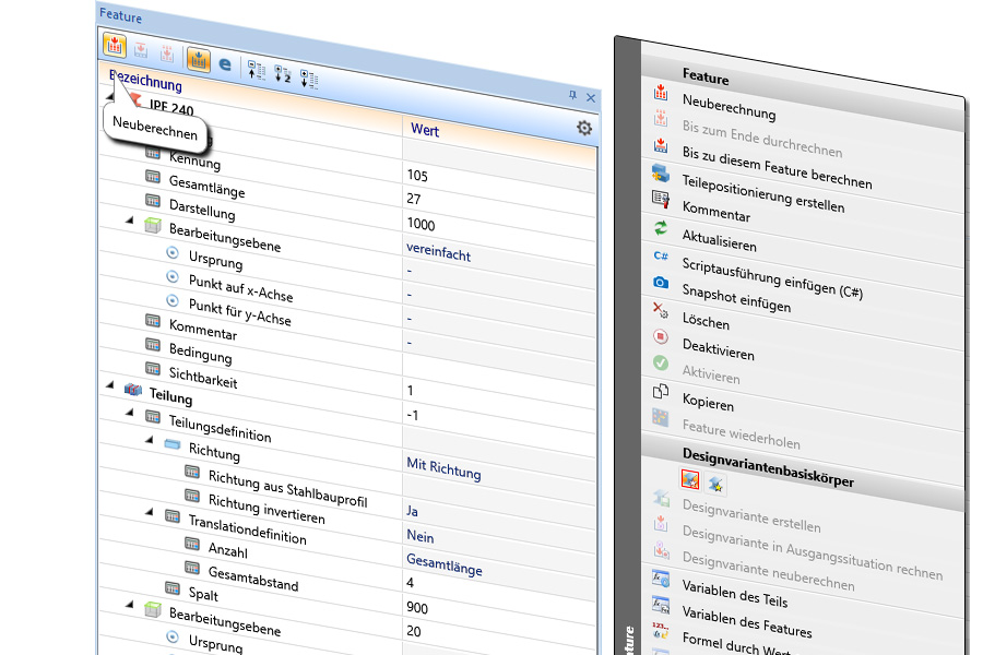 Das Andockfenster für das Feature-Protokoll ist – analog zur neugestalteten Anzeige der 3D-Teile- und der Ansichtsstruktur – einem Redesign unterzogen worden. Diese Neugestaltung sorgt für deutlich mehr Bedienungskomfort. So ermöglicht die neue Symbolleiste nicht nur den direkten Zugriff auf die Funktionen Neuberechnen, Nächstes Feature berechnen und Bis zum Ende durchrechnen, sondern auch die Automatische Neuberechnung und die Verwendung von Fremdverweisen können hier direkt aktiviert/deaktiviert werden. Im Zuge der Neugestaltung des Andockfensters sind auch die Kontextmenüs überarbeitet worden.