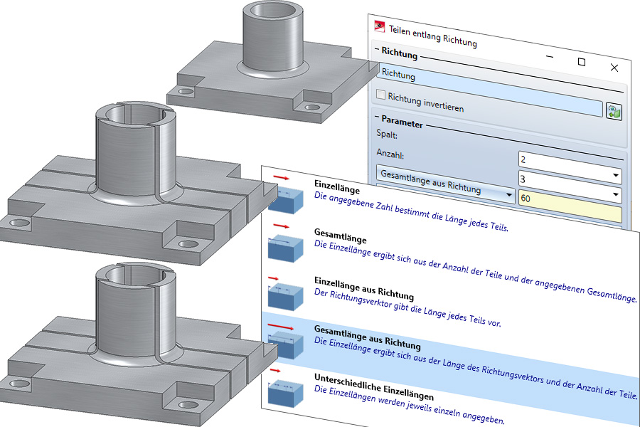 Mit der neuen Funktion Teilen entlang Richtung lassen sich nicht nur Profile sondern auch beliebige 3D-Teile vom Typ Solid entlang einer frei wählbaren Richtung in mehrere Teilstücke teilen. Dabei stehen verschiedene Teilungsoptionen zur Verfügung, beispielsweise können die einzelnen Teile unterschiedliche Längen haben. Darüber hinaus wird bei dieser Funktion ein entsprechendes Feature angelegt, so dass sich die Teilung auch nachträglich noch bearbeiten lässt.