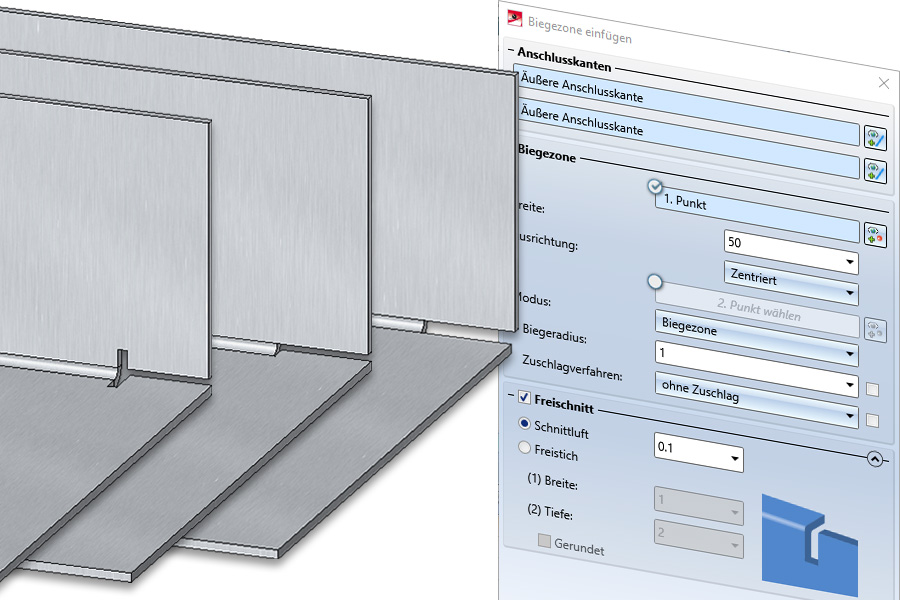 Die bisherigen Funktionen im Bereich Biegezone sind zu einer neuen Funktion Biegezone einfügen zusammengefasst worden. Die neue Funktion ist deutlich benutzerfreundlicher, beispielsweise werden im Dialog vorgenommene Einstellungen direkt in der Konstruktion als Vorschau visualisiert. Ein weiterer Vorteil der neuen Funktion ist die Unterstützung der Fräskanttechnik für Verbundbleche. Darüber hinaus werden alle Eingaben im Featureprotokoll aufgezeichnet und können dort nachträglich bearbeitet werden.