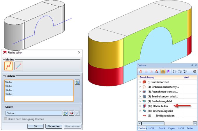 Für jede Teilung wird ein Feature mit dem Namen Fläche teilen erzeugt. Mit einem Doppelklick auf den Eintrag im Feature-Protokoll lässt sich der Funktionsdialog Fläche teilen starten, beispielsweise um die der Teilung zugrunde liegende Skizze zu bearbeiten, die Flächenauswahl zu ändern oder einen anderen Linienzug zu wählen.
