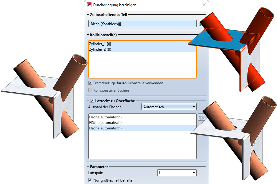 Die Funktion Durchdringung bereinigen ist komplett überarbeitet/modernisiert worden und ist jetzt identisch mit der gleichnamigen Funktion für Kantbleche. Die wesentlichen Neuerungen: