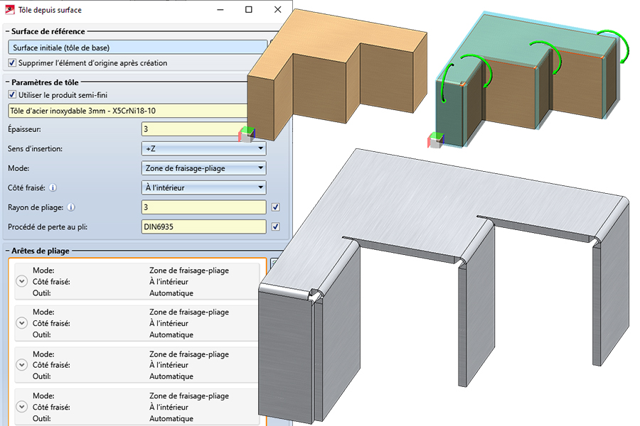 Au moyen d’une fenêtre complètement repensée de la fonction Nouvelle tôle depuis surface, vous pouvez dériver de nouveaux éléments de tôle avec zones de pliage ou zones de fraisage-pliage à partir des surfaces d’un élément 3D.
