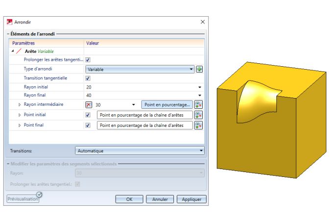 Pour arrondir, il est désormais possible de sélectionner également en une seule fois les arêtes limitrophes d'un point. Le menu contextuel pour la sélection des éléments à arrondir a été complété de l'option Arêtes adjacentes d'un point. Également pour les arrondis variables, il est désormais possible d'obtenir un arrondi dans un segment de l'élément.