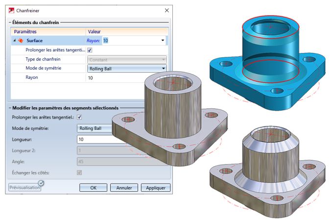 La fenêtre de dialogue de la fonction Chanfreiner a été mise à jour, et ce avec des possibilités de sélection étendues pour les éléments à chanfreiner, un aperçu amélioré et une modification des paramètres, des saisies de valeurs complétées, etc.